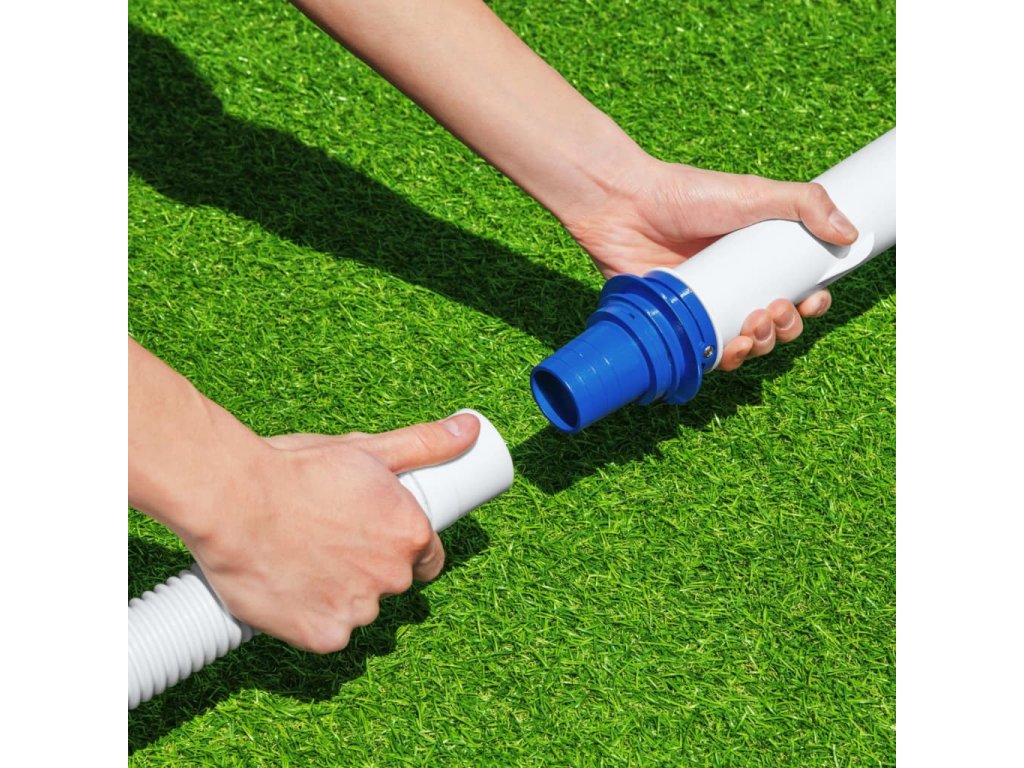 Vysavač AquaSweeper se velmi snadno používá, jednoduše ho připojte k filtračnímu čerpadlu vašeho bazénu a systém se spustí. Regulátor tlaku vám pomůže kontrolovat průtok přiváděné vody, takže ho můžete používat, i když máte vysoce výkonné filtrační čerpadlo. Sání probíhá rychle a tiše. 7,5 metrů dlouhá flexibilní hadice vám umožní dosáhnout i do nejvzdálenějších bodů nádrže. Součástí balení jsou konektory, díky kterým je vysavač kompatibilní se všemi bazény v kolekci Bestway, včetně bazénů s měkkou strukturou.