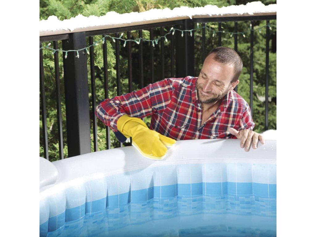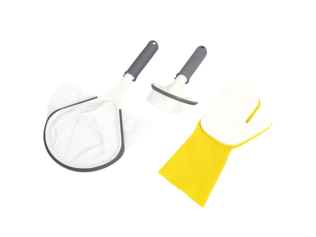 Podběrák má měkký okraj, který chrání povrch vířivky, a design kruhového tvaru, který zapadá do křivek vnitřku vířivky. Hluboká síťka je perfektní ke sběru nečistot a lze ji držet přímo v ruce nebo ji připojit ke standardní teleskopické tyči, potřebujete-li delší dosah. Kartáč je také vybavený měkkým okrajem a má nylonové štětiny, aby při čištění vířivky nedocházelo k poškrábání povrchu. Kartáč je také možné používat ručně nebo se standardní teleskopickou tyčí. Čisticí latexová rukavice je spojená s čisticí houbičkou, se kterou snáze vydrhnete vířivku na úrovni vodní hladiny, aniž by se chemikálie dostaly na vaši pokožku.