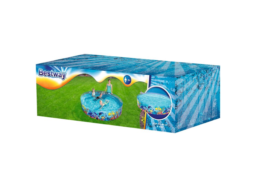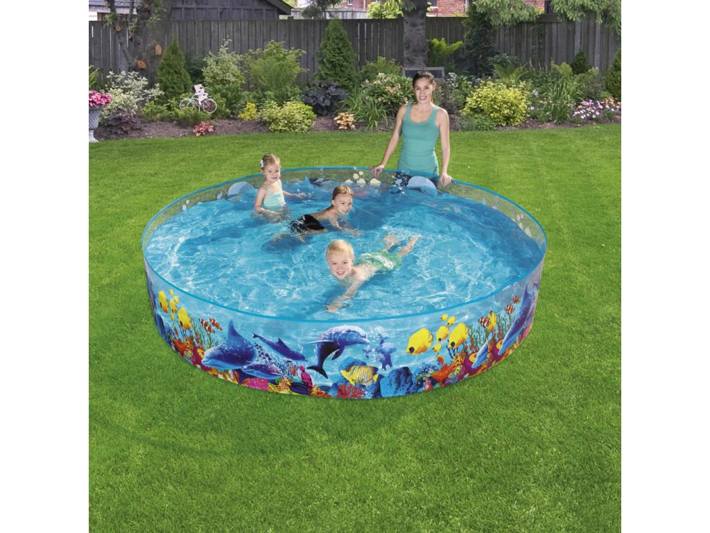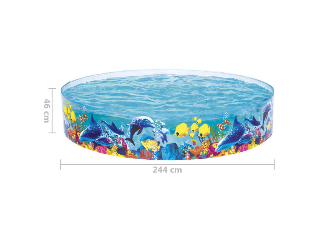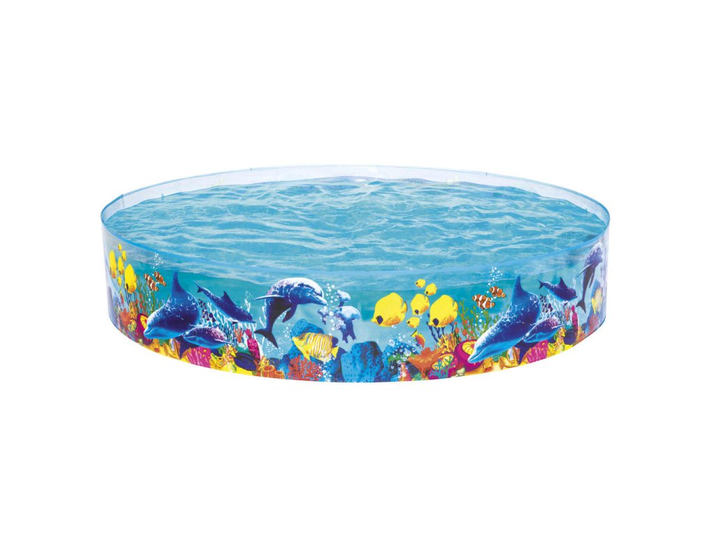 Tento robustní a odolný bazén je vyrobený z pevných PVC stěn, které jsou trvale připevněné k silné vinylové podlaze. Pojme až 2 074 litrů vody. Průhledné stěny se zajímavou grafikou barevného korálového útesu vytvářejí nápadný vizuální efekt.