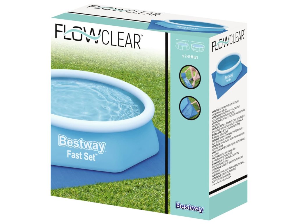Podložku jednoduše rozprostřete na místě, kde plánujete vztyčit váš bazén Bestway. Jednou z výhod bazénových podložek je fantastická ochrana vašeho trávníku. Voda, která se vylévá přes okraje bazénu, se bezpečně shromažďuje na povrchu podložky, takže se při výstupu z bazénu nemusíte obávat, že zapadnete po kolena do bahna. Tato bazénová podložka je vhodná pro bazény Fast Set a Steel Pro s délkou 244 cm.