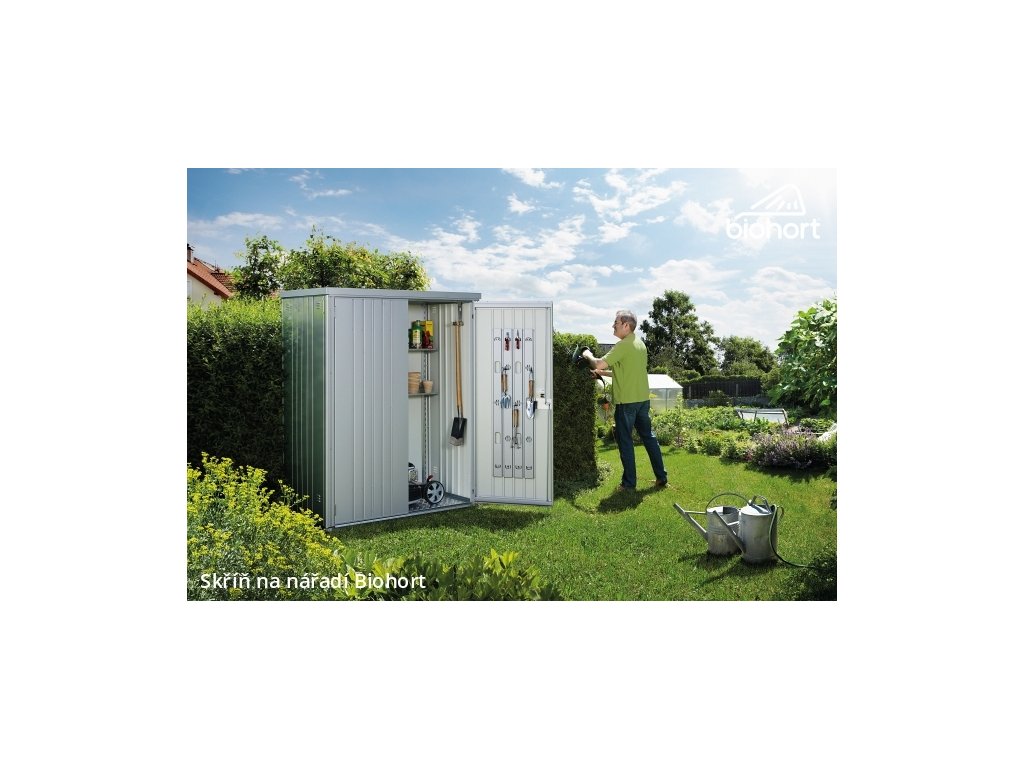 Přednosti zahradních domků Biohort: Skříň na nářadí splňuje nejvyšší nároky díky robustní konstrukci a rozsáhlé základní výbavě. Komfort poskytují dvoukřídlé dveře s cylindrickou vložkou s otočnou rukojetí.