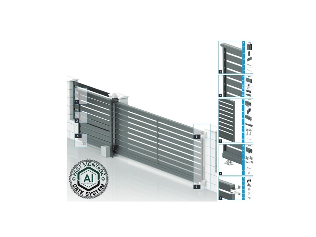 Samonosná posuvná brána se dodává jako montážní set v demontovaném stavu. Je navržena tak, aby její montáž byla rychlá a snadná, bez nutnosti svařování. Seznam součástí, které jsou součástí sady, naleznete v části věnované dílům sady. Precizně navržený montážní systém zajišťuje, že brána bude pevná a stabilní a zároveň si zachová atraktivní vzhled.