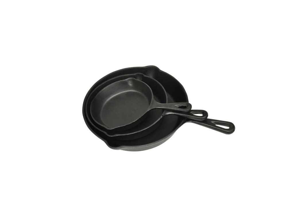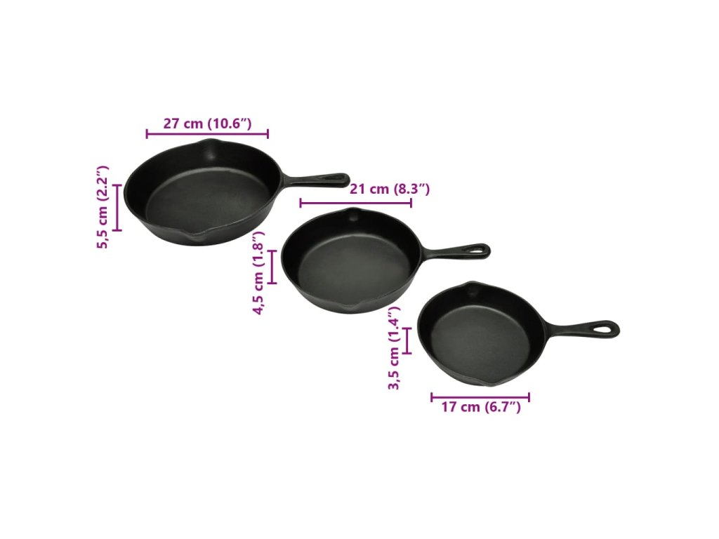 S naší kvalitní sadou 3 ks velkých litinových pánví, najdete vaření radostný zážitek! Tato sada obsahuje tři litinové pánve na 17, 21 a 27 cm v průměru. Jsou ideální pro domácí i kempové vaření. Pánve jsou vhodné pro všechny typy varných desek, včetně plynové, elektrické, keramické, halogenové, na tuhá paliva a indukční sporáky. Jsou vhodné i pro použití na grilování. Tyto pánve mají hladkou plochu dna, proto jsou ideální pro vaření smažených brambor, smaženici, bramborových krokety, řízek, klobásy, atd. Litina má nelepí povrch a je teplovodivá. Pro údržbu, ujistěte se, že postupujete podle pokynů pro péči a tipy. Potřebuje být čištěna horkou vodou a bez čistící prostředku. Dodávka zahrnuje 3 litinové pánve.