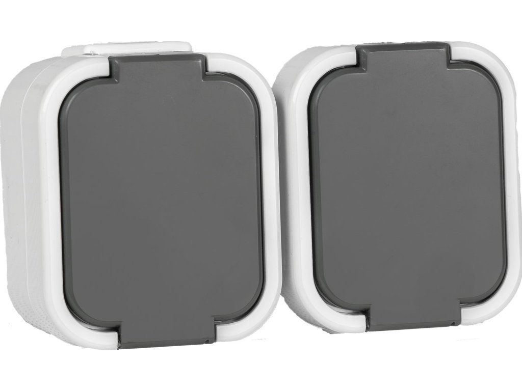 Zásuvka podvojná 2x (2P+PE) SCHUKO. Na povrch. V šedé barvě. Chráněno před průnikem stříkající vody a pevných částic nad 1mm - IP44.Stupeň krytí IP:IP44