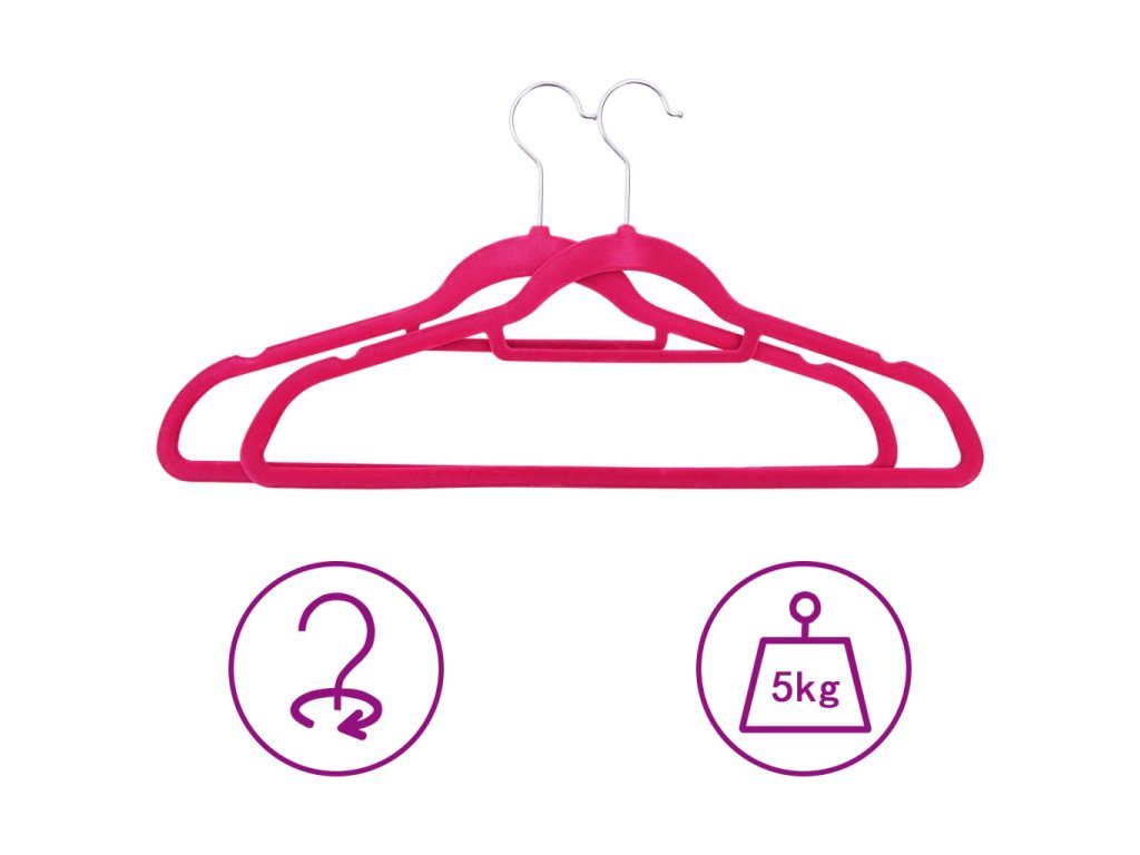 Plastová šatní ramínka v této sadě jsou vyrobená z plastu a kovu, takže mají dlouhou životnost a jsou dostatečně pevná, aby unesla i těžší oblečení. Sametem potažená ramínka jsou hladká a chrání oblečení před poškozením. Kolem dokola otočný háček poskytuje flexibilitu při organizaci oblečení na různých místech. Dvě drážky na obou stranách ramínka zabraňují sklouznutí oblečení nebo oděvních doplňků.