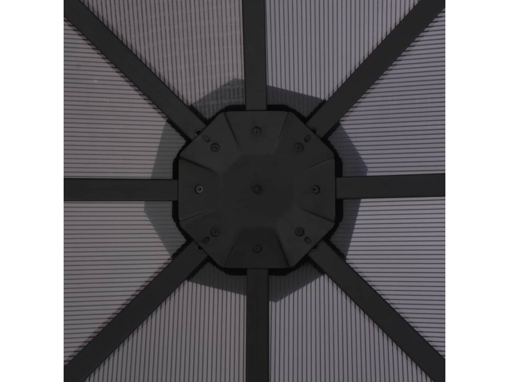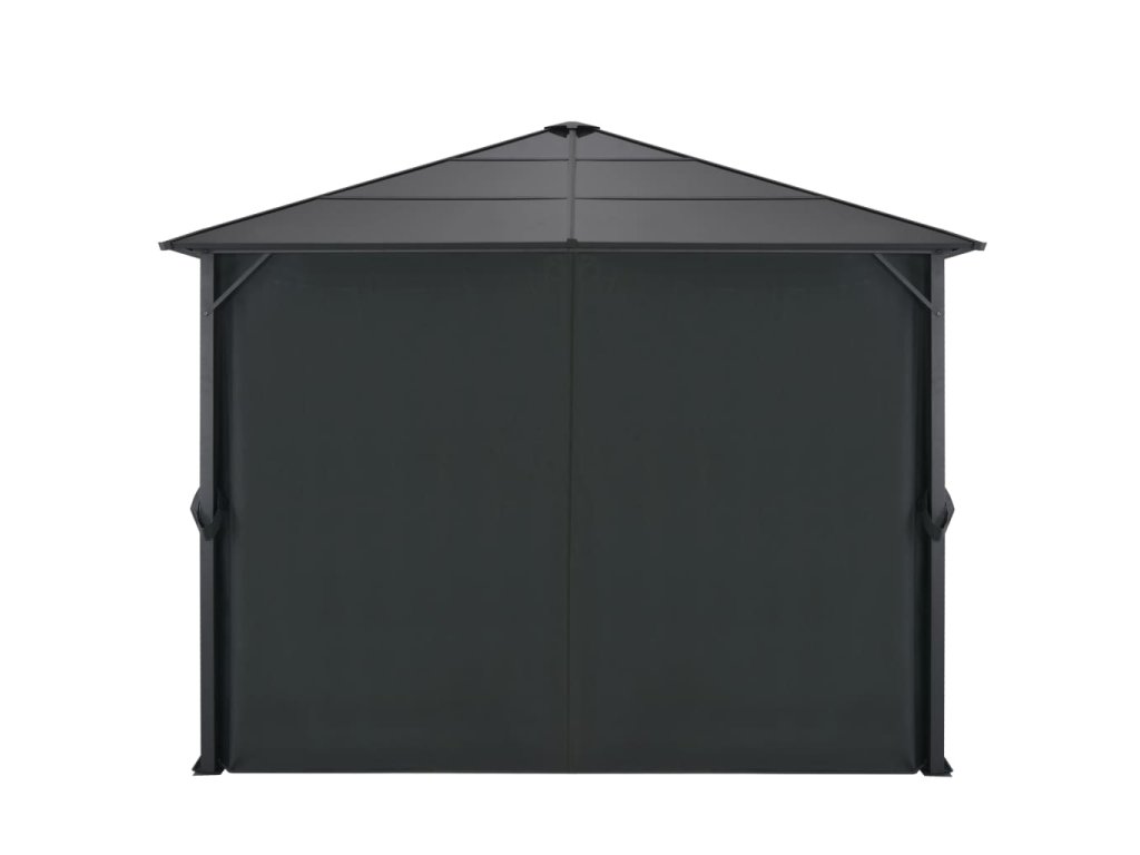 Střecha je vyrobena z 6 mm silných polykarbonátových desek a ochrání vás jak před žárem, tak i před škodlivými UV paprsky přímého slunečního záření. Altán má pevnou konstrukci z pevného hliníku a oceli, a proto nerezaví a je mimořádně stabilní. Disponuje rovněž 4 bočními stěnami, které můžete zatáhnout v případě nevlídného počasí. Pro jednoduché uvázání závěsů najdete na altánu poutka na suchý zip.