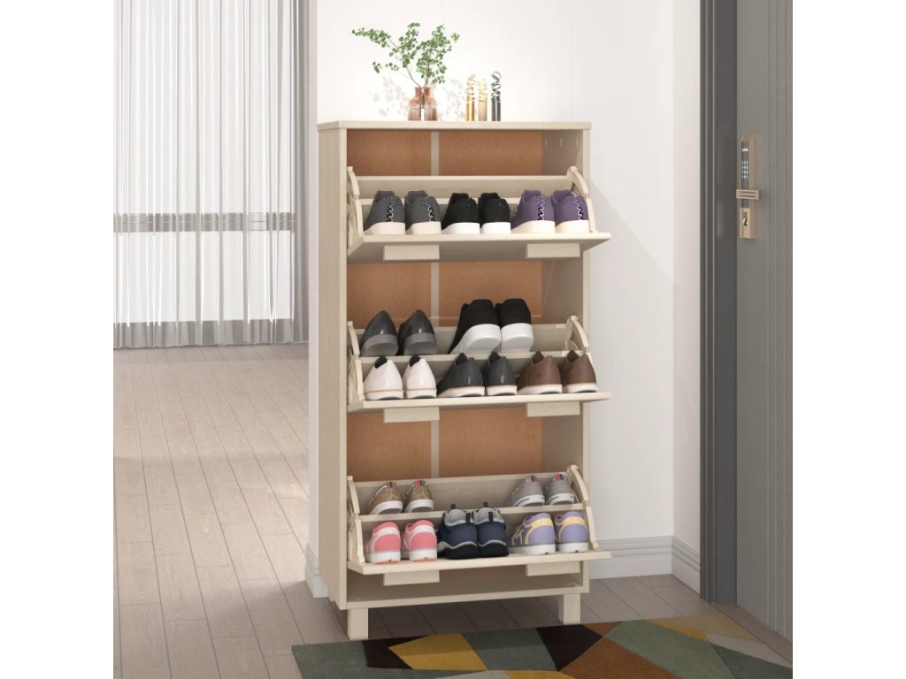 Regál na boty je zhotovený z masivního borového dřeva, takže je stabilní a robustní. Obsahuje 3 výklopné zásuvky, poskytne vám tedy spoustu prostoru pro uložení vaší obuvi a zároveň ji ochrání před prachem. S tímto praktickým botníkem, už se nebudete muset zlobit, že máte boty rozházené po celé chodbě.