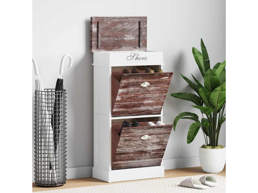 Skříňka je vyrobena ze dřeva pavlovnie, je tedy mimořádně odolná a stabilní. Dvě velké vyklápěcí přihrádky jsou opatřeny příčnými tyčemi, aby vše zůstalo na svém místě. Horní deska botníku se navíc dá odklopit, takže si do horní přihrádky můžete uschovat různé doplňky k obuvi, jako jsou tkaničky, vložky do bot a další maličkosti. Sestavení našeho botníku je snadné.