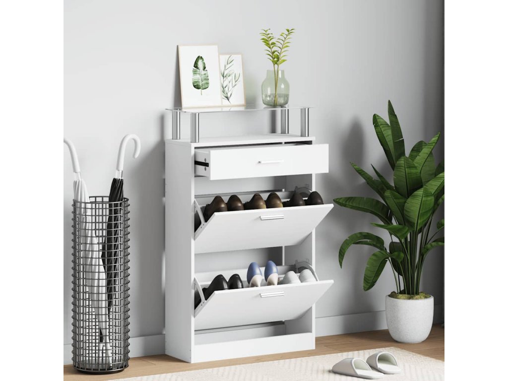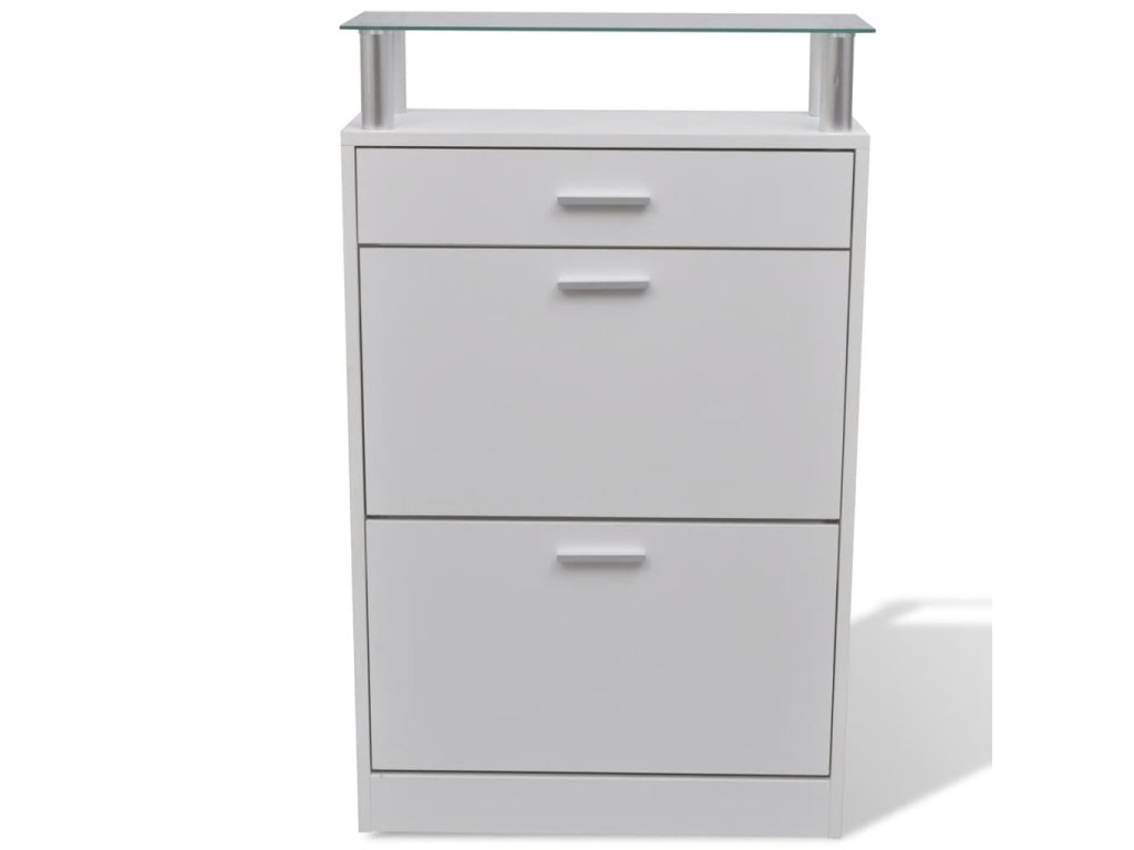 vidaXL Botník se zásuvkou a horním skleněnou poličkou dřevěný bílý