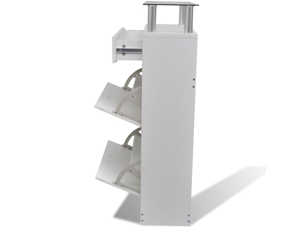 Každá z velkých přihrádek má střední dělicí příčku, abyste měli boty uspořádané. Můžete do nich uložit až 12 párů bot, a ochránit je tak před prachem. Šuplík v horní části můžete používat na doplňky jako jsou tkaničky, vložky do bot a další drobnosti. Horní skleněná polička se hodí k vystavování drobných předmětů.
