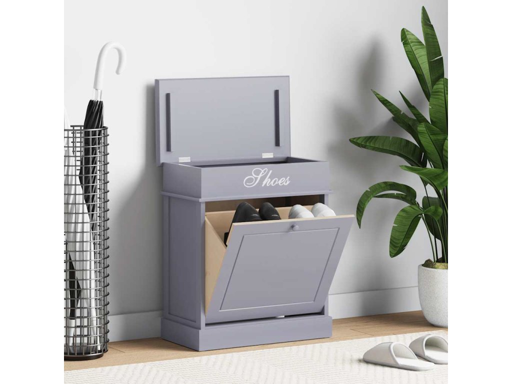 Skříňka je vyrobena ze dřeva pavlovnie, je tedy mimořádně odolná a stabilní. Velká vyklápěcí přihrádka je opatřena příčnými tyčemi, aby vše zůstalo na svém místě. Horní deska botníku se navíc dá odklopit, takže si do horní přihrádky můžete uschovat různé doplňky k obuvi, jako jsou tkaničky, vložky do bot a další maličkosti. Sestavení našeho botníku je snadné.