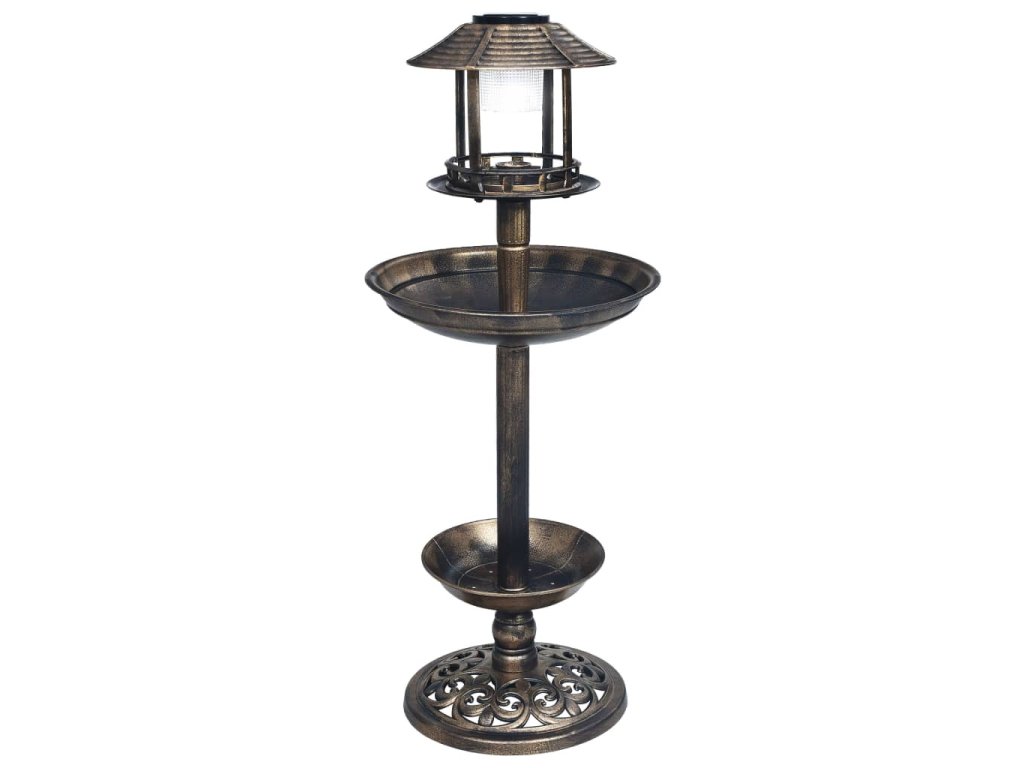 Ptačí koupátko má stojanový design a je zhotovené z lehkého a klimaticky odolného plastu, který je zárukou dlouhodobého používání. Horní police poslouží jako krmítko pro ptáčky, před vlhkostí ho chrání stříška. Široká mísa poslouží jako pítko nebo koupátko. Spodní police je perfektní pro pěstování květin. Celá dekorace je navíc doplněná LED světly na solární energii, která zaručí hezké noční osvětlení.