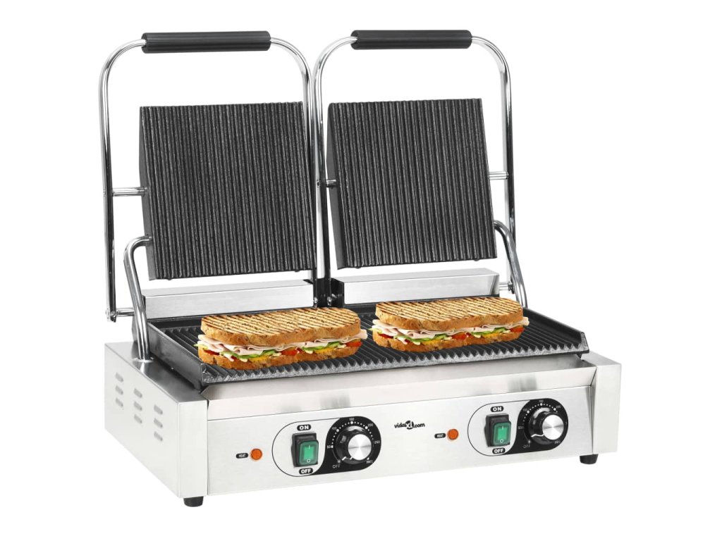 Na našem dvojitém drážkovaném grilu na dvě panini rychle vykouzlíte panini, sendviče, hamburgery, kuře, zeleninu atd.