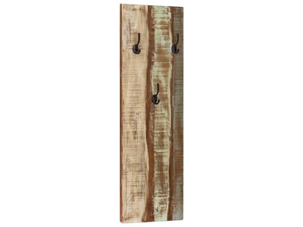 Věšák je vyroben z masivního recyklovaného dřeva, a to ze směsi různých typů dřevin, mezi něž patří teak, mangovník, borovice, buk a další. Použité dřevo pochází ze starých továren, kůlen a lodí a představuje fantastický materiál pro výrobu nábytku, který je šetrný k životnímu prostředí. Jelikož je každý kus vyrobený ručně, barevně se liší a narazíte na mnoho odstínů modré, zelené, krémové a občas také oranžové, červené a růžové. To znamená, že každý kus je naprosto jedinečný! Každý věšák je vybaven 3 háčky na zavěšení tašek, kabátů, deštníků, přívěsků, klíčů a dalších předmětů, čímž výrazně šetří místo. Sadu lze snadno připevnit na zeď.