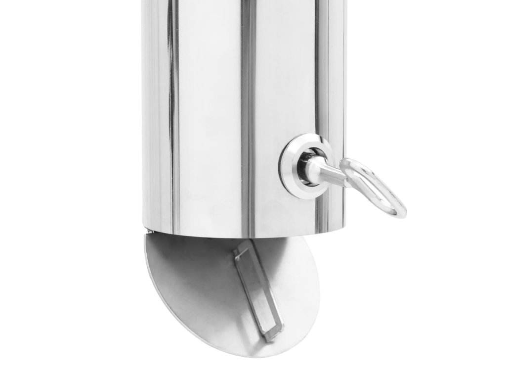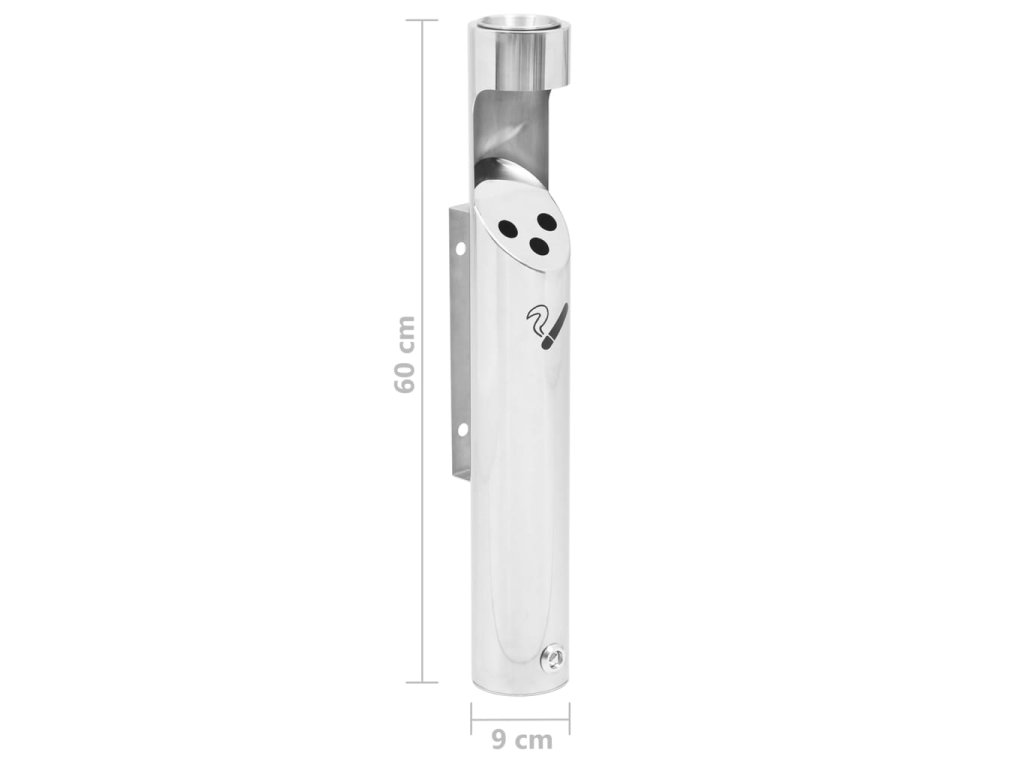 Tento popelník je vyrobený z nerezové oceli, připevňuje se na zeď a hodí se do interiéru i exteriéru. Má tvar válce s malým průměrem, takže je prostorově úsporný, a přesto má velkou kapacitu. Výklopné dno se otevírá směrem dolů pro snadné vyprazdňování popelníku.
