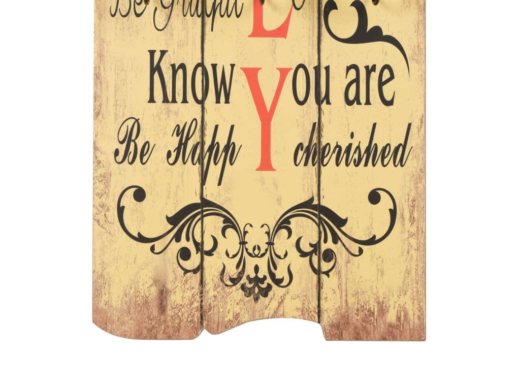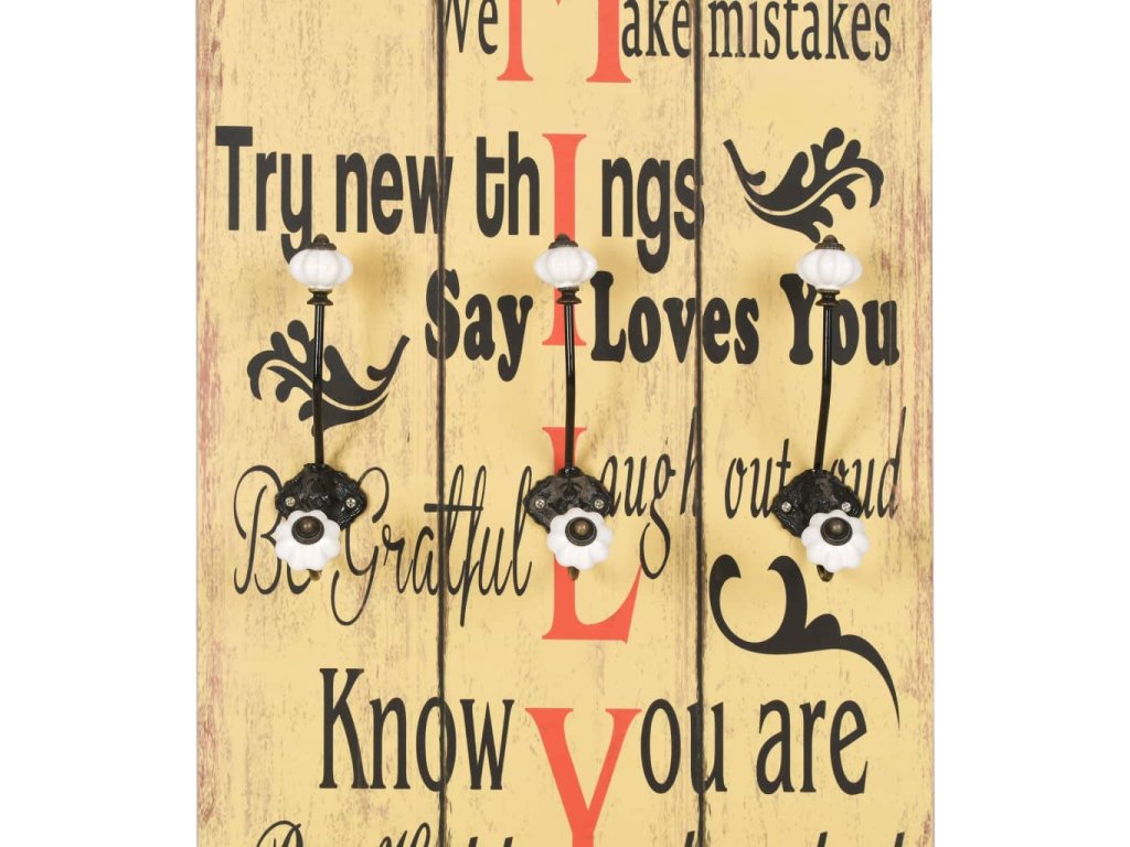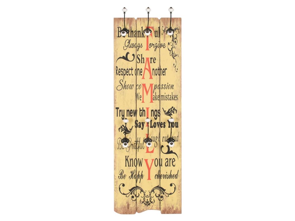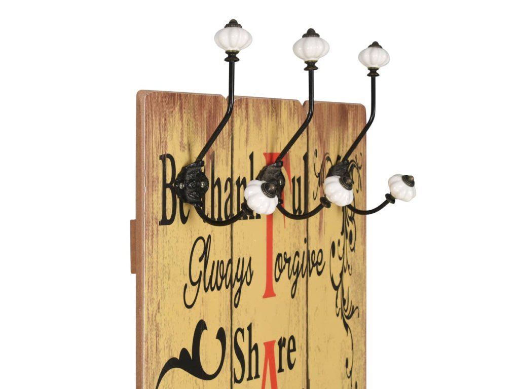 Tento nástěnný věšák s 6 háčky vaše hosty okamžitě na první pohled zaujme svým nápisem ve vintage stylu, jenž říká „Be thankful Always forgive Share Respect one another Show compassion We make mistakes Try new things Say I love you Be grateful Laugh out loud Know you are cherished Be happy." (Buď vděčný, vždy odpouštěj, sdílej, respektuj ostatní, projevuj soucit, děláme chyby, zkoušej nové věci, říkej: Mám tě rád, buď uznalý, směj se nahlas, věz, že jsi milován, buď šťastný.)