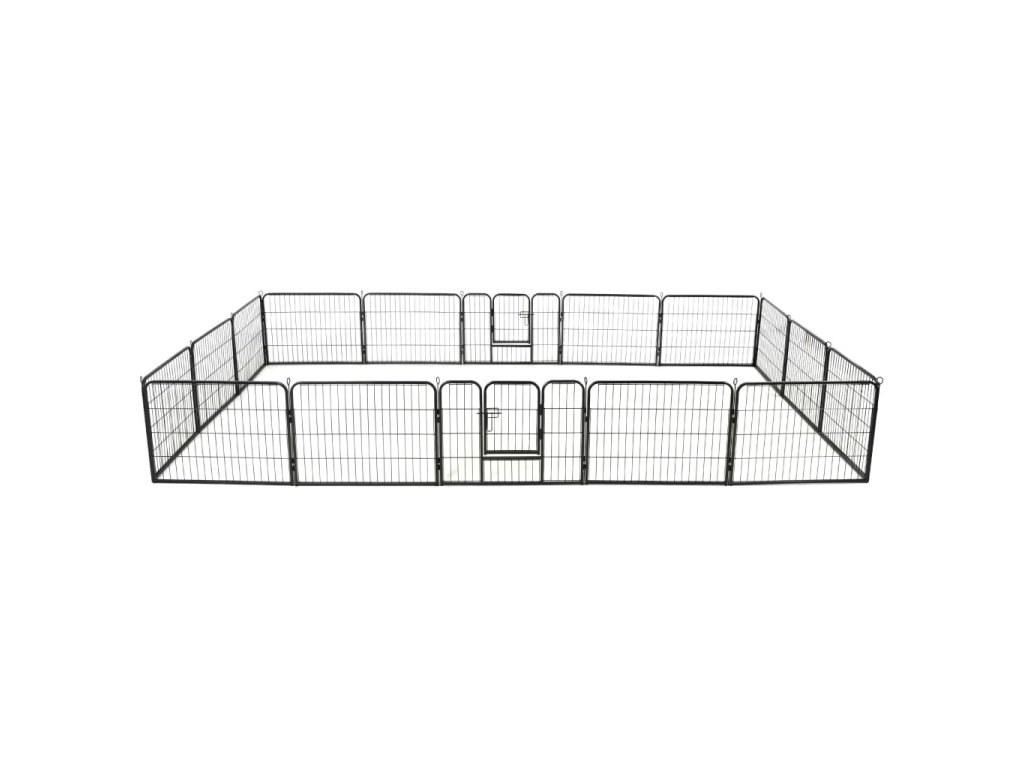 Psí výběh lze snadno rozložit nebo složit. Skládá se z 16 vysoce odolných panelů, přičemž každý panel lze snadno připojit k dalšímu, což vám umožní stavět ohrádku do různých tvarů. Výběh je opatřen dvojími závěsnými dvířky s bezpečnostními západkami, jež zajišťují snadný přístup. Ohrádka je pevná, odolná vůči povětrnostním vlivům a vyrobená z nerezové oceli s práškovým nástřikem, takže je vhodná pro venkovní i vnitřní použití. Součástí dodávky jsou i kolíky pro upevnění k zemi, které zajišťují bezpečnost ohrádky pro psy a dodávají jí stabilitu.