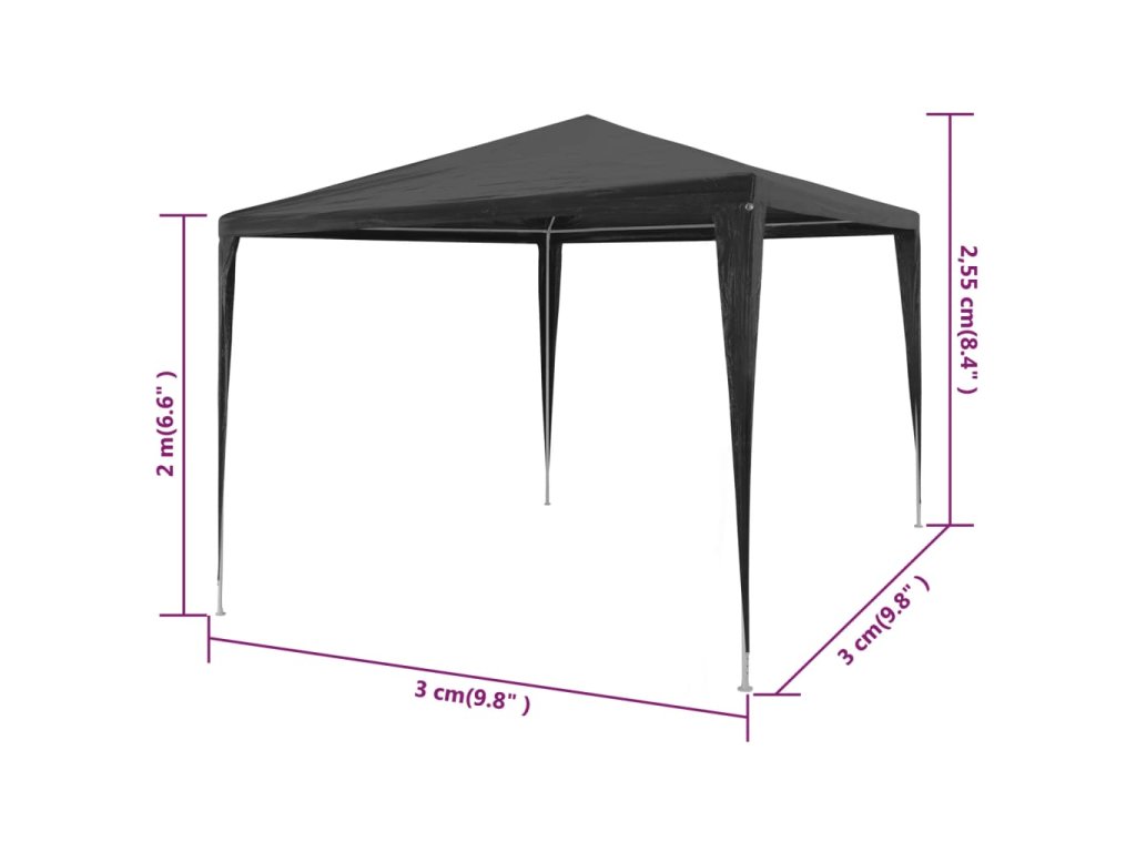 Párty stan je vyroben z polyethylenového materiálu odolného vůči UV záření a vodě, a proto je velmi praktický pro venkovní použití. Rám je vyroben z nerezové oceli, díky čemuž je venkovní stříška stabilní a odolná. Zahradní altán se snadno montuje.