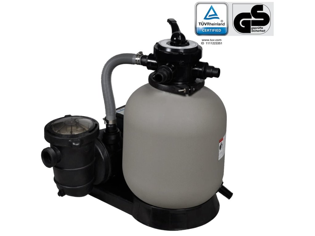 Pískový filtr dokáže přefiltrovat 11000 litrů za hodinu a je vybaven rezistentní a korozivzdornou filtrační nádrž, která je odolná vůči kyselému vlivu chlorované vody v bazénu. K dispozici je také předfiltr navíc, který chrání hrubý pískový filtr před znečištěním. Má vícecestný ventil pro snadné ovládání a snadno čitelný manometr. Konstrukce horní přírubové svorky umožňuje otáčení 360 stupňů pro snadnou instalaci. Pro bezpečné uchycení obsahuje tato sada upevnitelnou základnu.