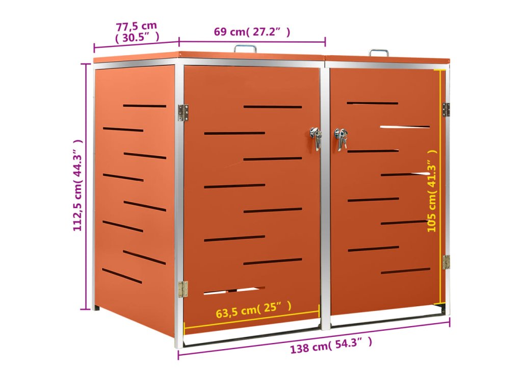 Tento přístřešek na popelnice je vyroben z pozinkovaného ocelového panelu a rámu z nerezové oceli, takže je mimořádně robustní a odolný proti korozi. Dutá konstrukce umožňuje cirkulaci vzduchu a zabraňuje, aby v popelnicích vznikal nepříjemný zápach. Uzamykací systém zároveň zajišťuje bezpečné uložení odpadků. Praktické víko a pružiny navíc usnadňují vkládání a vyjímání popelnic.