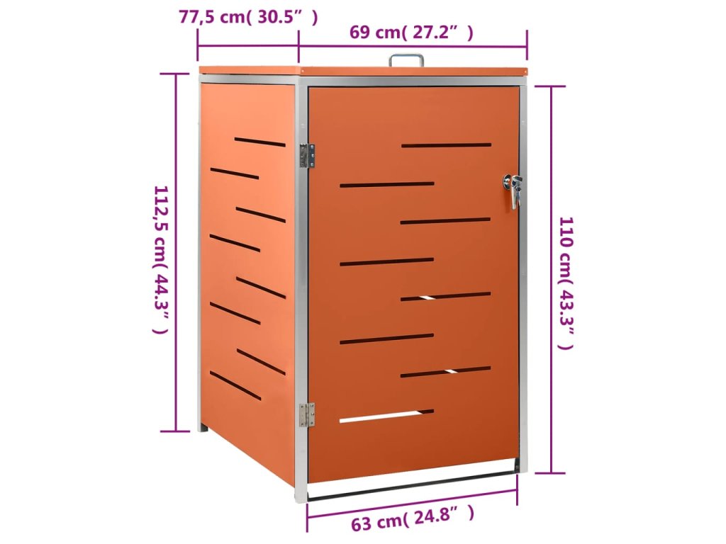 Tento přístřešek na popelnice je vyroben z pozinkovaného ocelového panelu a rámu z nerezové oceli, takže je mimořádně robustní a odolný proti korozi. Dutá konstrukce umožňuje cirkulaci vzduchu a zabraňuje, aby v popelnicích vznikal nepříjemný zápach. Uzamykací systém zároveň zajišťuje bezpečné uložení odpadků. Praktické víko a pružiny navíc usnadňují vkládání a vyjímání popelnic.