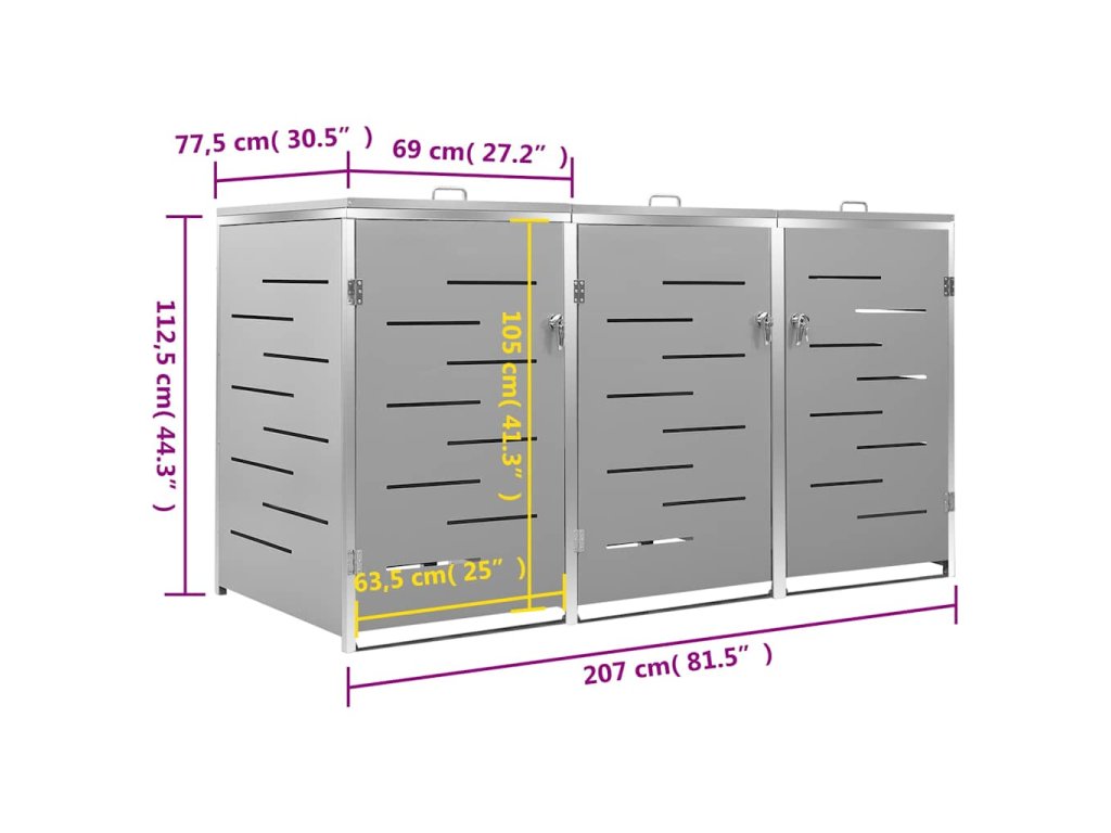 vidaXL Přístřešek na tři popelnice 207 x 77,5 x 115 cm nerezová ocel