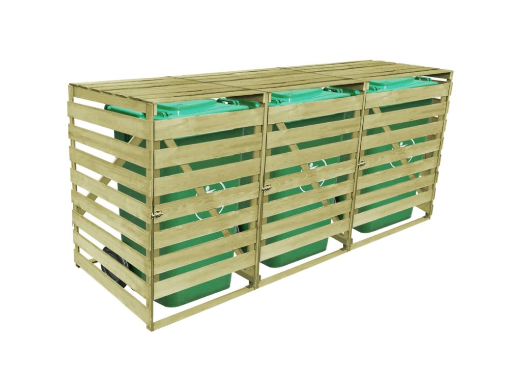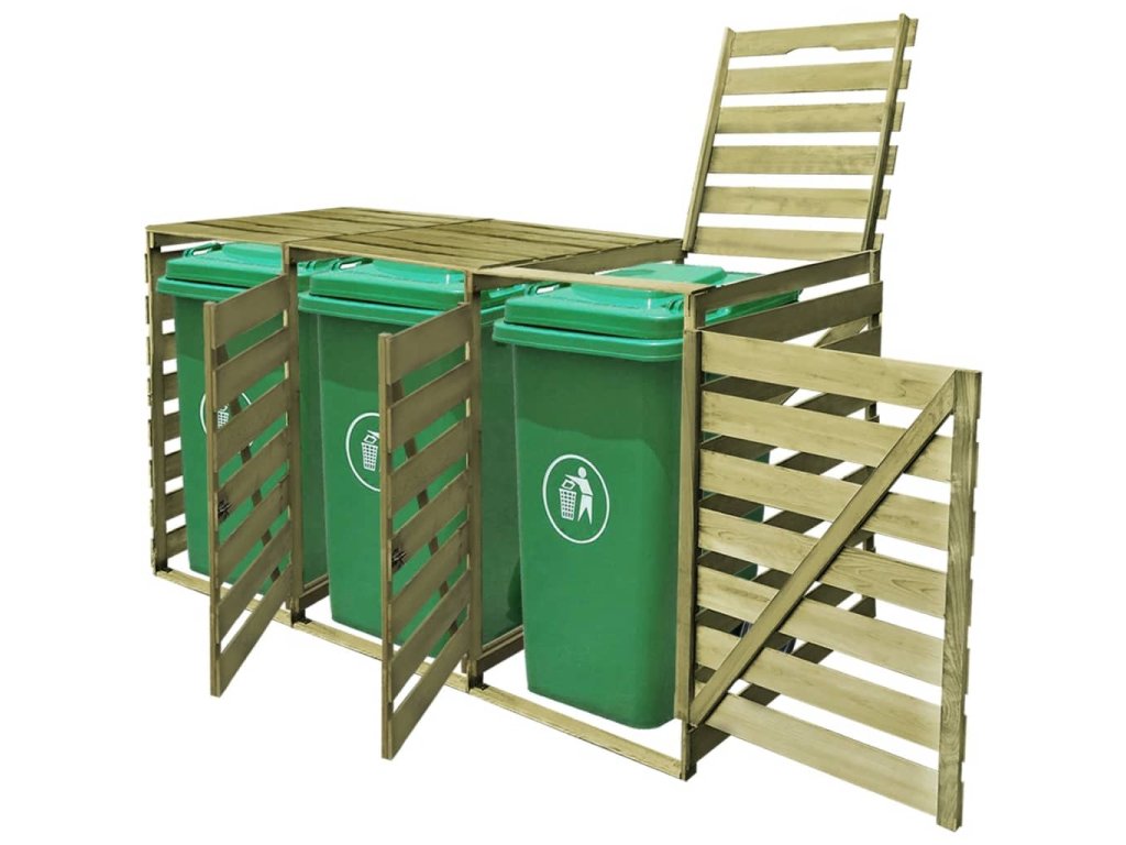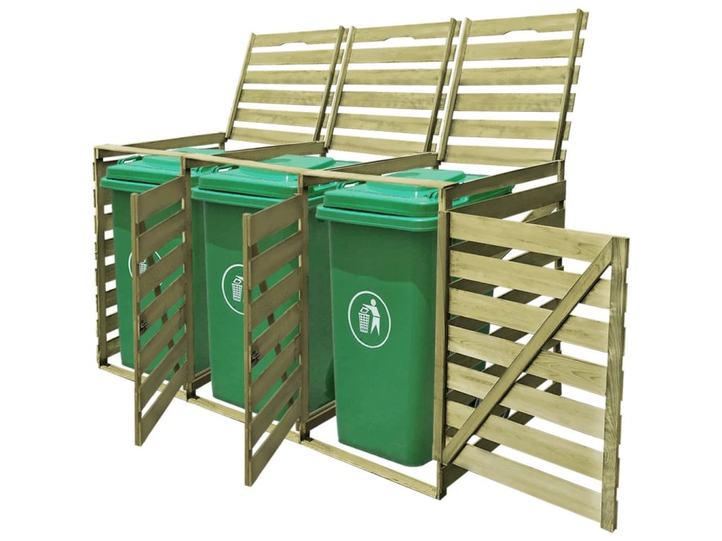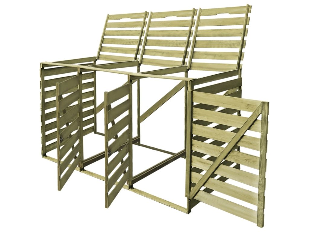 Tato kůlna na popelnice je vyrobená ze zeleně impregnovaného borového dřeva, je velmi robustní, odolná vůči hnilobě a má dlouhou životnost. Přístřešek pojme tři 240l popelnice (o maximální výšce 115 cm) a zároveň hezky doplní vzhled vaší zahrady. Poznámka: Popelnice nejsou součástí balení.