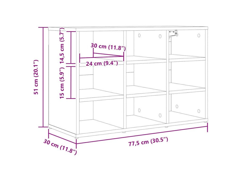 - Odolný materiál: Tahle skříň na boty je vyrobená z kompozitního dřeva, které je odolné a snese každodenní používání, zatímco si drží svůj elegantní vzhled. Tento robustní materiál je trvalým řešením pro uložení bot ve vaší chodbě.