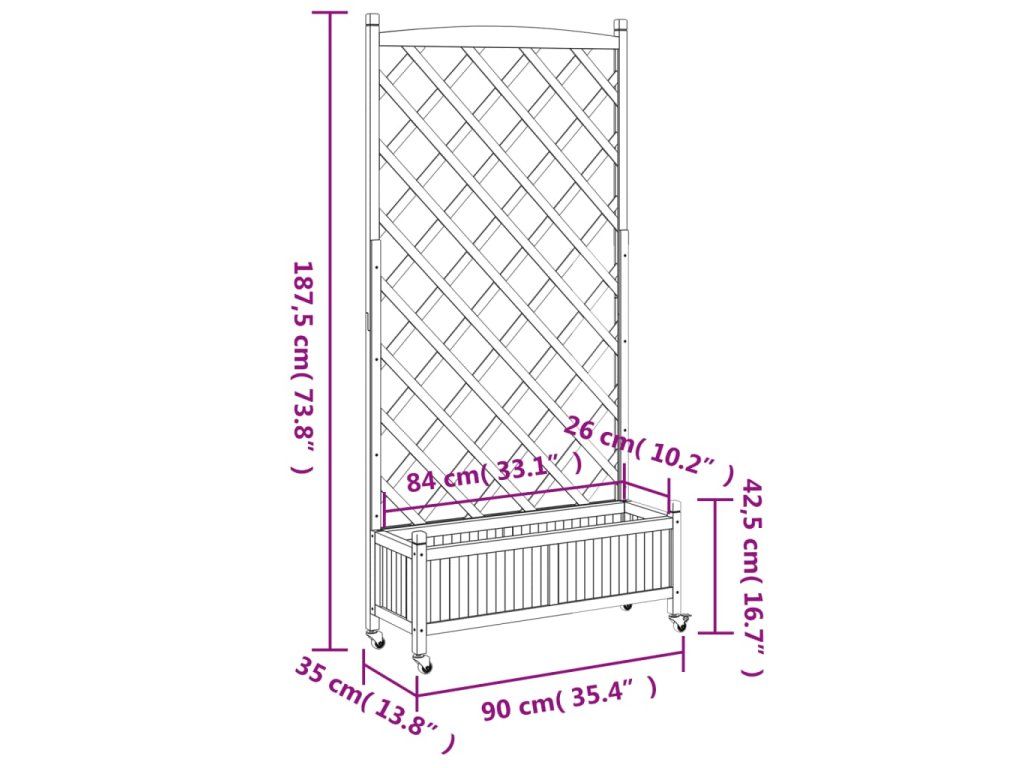Tento dřevěný truhlík s treláží a kolečky představuje skvělé řešení pro pěstování popínavých rostlin na zahradě, verandě nebo terase.