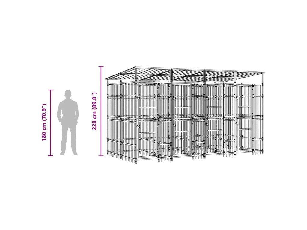 Tento psí kotec poskytuje dostatek prostoru pro cvičení. Stěny z ocelových tyčí pomáhají předcházet neplechám a neočekávaným nehodám a zároveň umožňují větrání. Díky robustní ocelové konstrukci s práškovým nástřikem je tento psí kotec odolný a vyrobený pro dlouhou životnost. Střecha chrání před sluncem, deštěm, sněhem a dalšími povětrnostními vlivy. Dveře s výklopnými dveřmi a uzamykatelným západkovým systémem zajišťují vašim psům větší bezpečnost a ochranu.