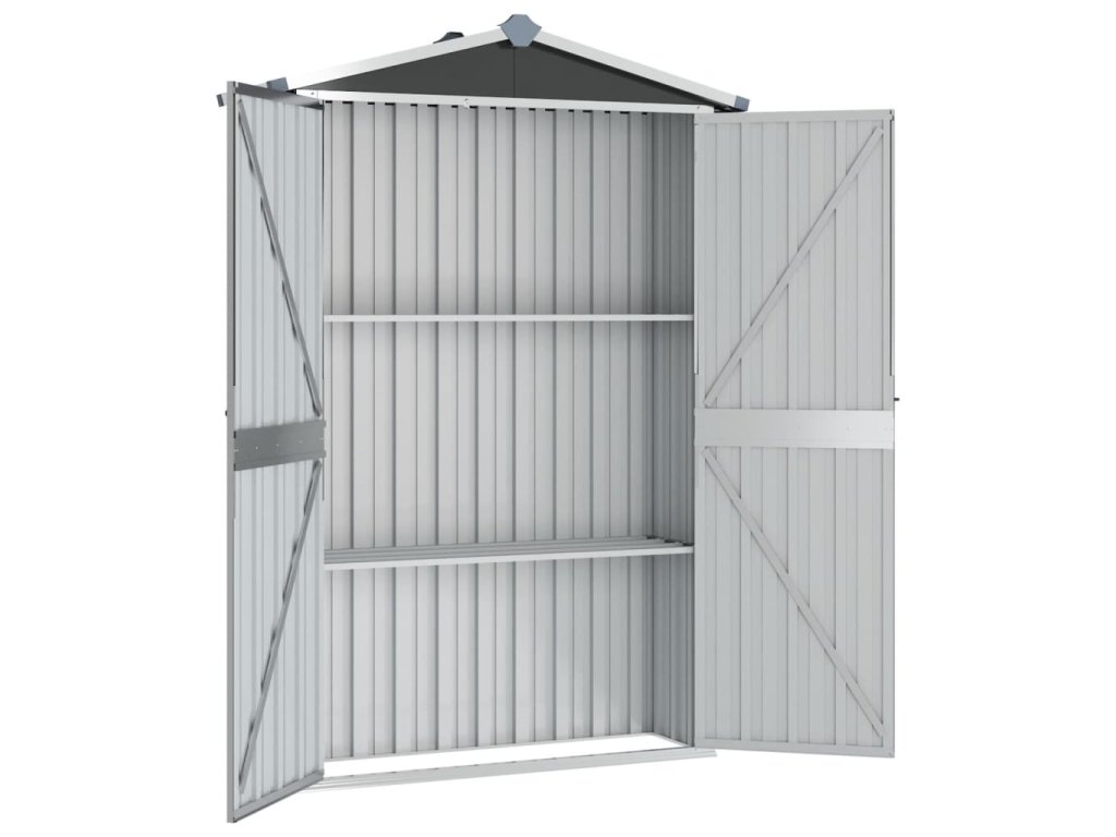 Tato úložná kůlna je vybavena větracími otvory, které zajišťují ventilaci a předchází hromadění vlhkosti a zápachu. Police nabízí dostatek prostoru k přehlednému uložení vašich věcí. Tato venkovní úložná kůlna z pozinkované oceli vyžaduje jen minimální údržbu a má velmi dlouhou životnost. Dvoukřídlé dveře umožňují snadný vstup a výstup. Dešťová voda automaticky stéká ze zešikmené střechy.