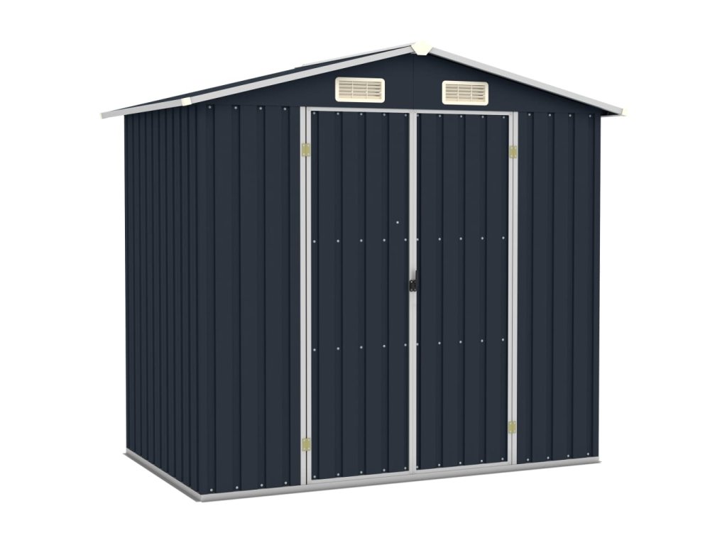 Tato úložná kůlna je vybavená ventilačními otvory, navrženými jako okenice, které chrání interiér před deštěm. Také zajišťují nepřetržitou ventilaci, takže se předchází hromadění vlhkosti a zápachu v domku. Tato venkovní úložná kůlna z pozinkované oceli vyžaduje jen minimální údržbu a má velmi dlouhou životnost. Dvoukřídlé dveře umožňují snadný vstup a výstup. Dešťová voda automaticky stéká ze zešikmené střechy.