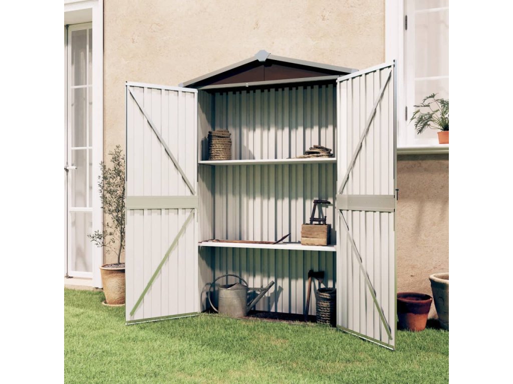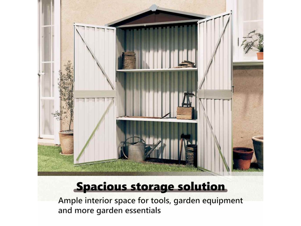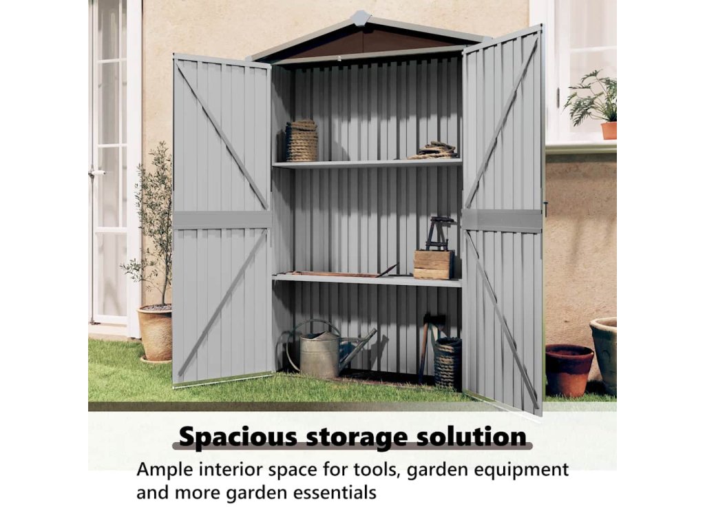 Tento skladovací domek je vybaven větracími otvory, které zajišťují větrání a snižují hromadění vlhkosti a zápachu v domě. Díky policám nabízí dostatek úložného prostoru pro uspořádání vašich nezbytných věcí. Tento venkovní skladovací domek je navíc vyroben z pozinkované oceli, takže vyžaduje minimální údržbu a je velmi odolný. Dvoukřídlé otevírací dveře v přední části umožňují snadný vstup a výstup. Dešťová voda se díky šikmé konstrukci automaticky odvádí ze střechy.