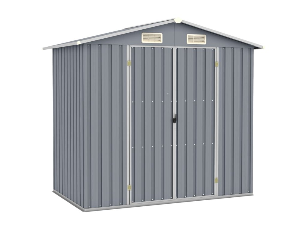 Tato úložná kůlna je vybavená ventilačními otvory, navrženými jako okenice, které chrání interiér před deštěm. Také zajišťují nepřetržitou ventilaci, takže se předchází hromadění vlhkosti a zápachu v domku. Tato venkovní úložná kůlna z pozinkované oceli vyžaduje jen minimální údržbu a má velmi dlouhou životnost. Dvoukřídlé dveře umožňují snadný vstup a výstup. Dešťová voda automaticky stéká ze zešikmené střechy.