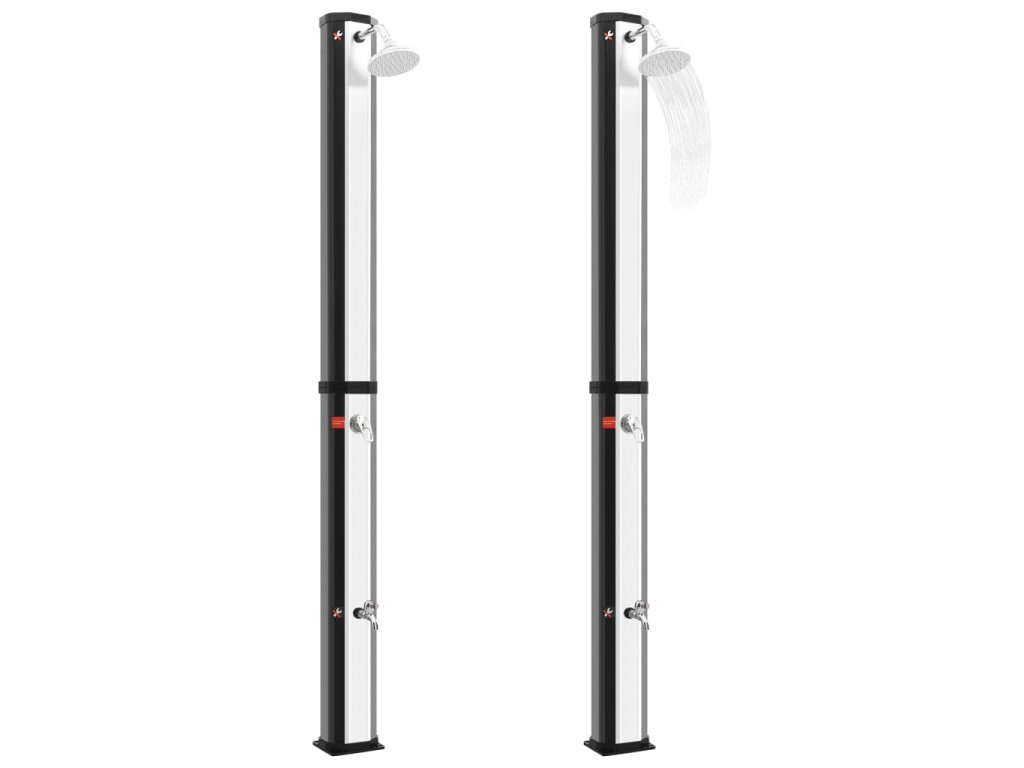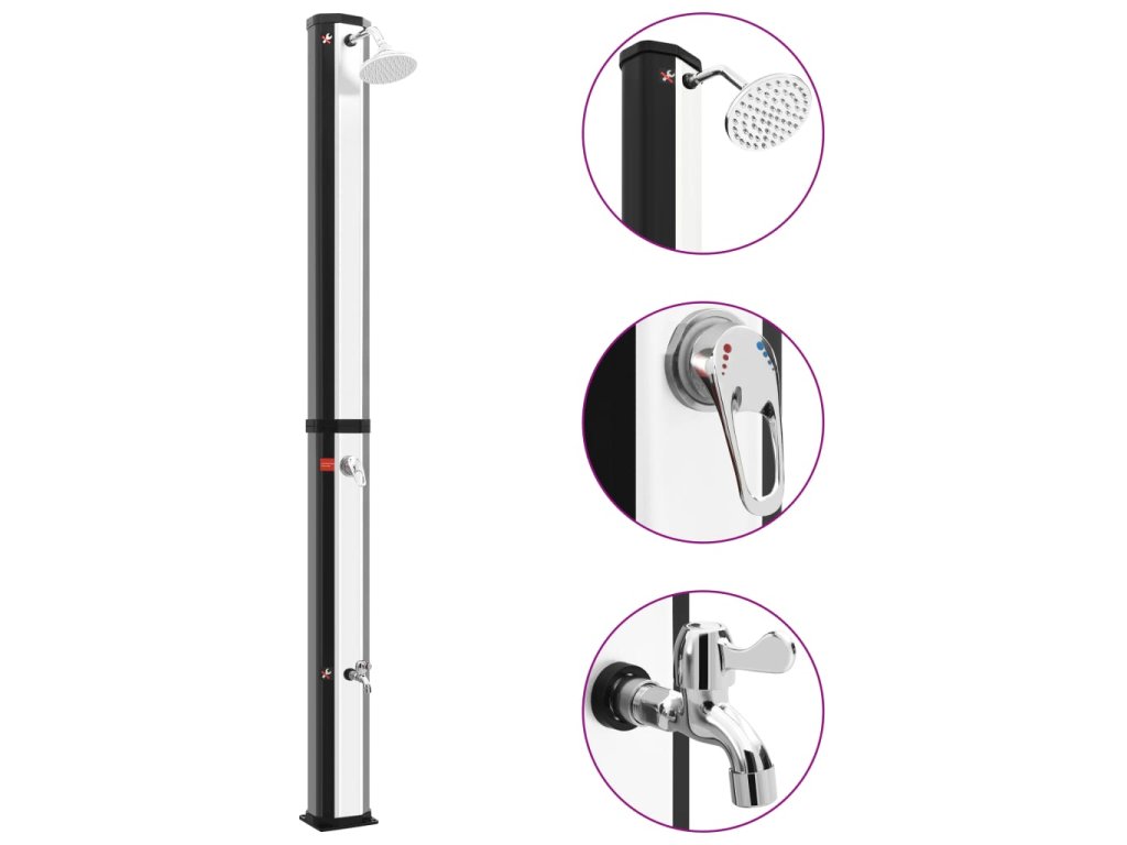 Solární energie, kterou absorbuje, ohřeje vodu uvnitř nádrže a nabídne vám perfektní sprchu! Vodu je možné ohřát až na 60 °C. Je vybavena nádrží na vodu o objemu 35 l. Součástí je také kohoutek s dalším praktickým využitím. Součástí balení jsou také šrouby pro pevné a stabilní upevnění sprchové základny na jakýkoli rovný pevný povrch. Tato solární sprcha s elegantním a exkluzivním vzhledem se hodí do vaší zahrady nebo k bazénu.