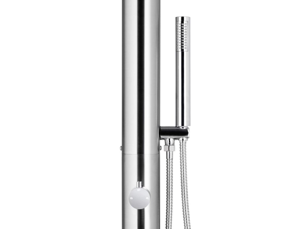 Tato zahradní sprcha je vyrobená z nerezové oceli, takže je klimaticky odolná. Sprchový systém má hlavovou sprchu a ruční sprchu, aby vám usnadnil práci na zahradě a umožnil zalévání a rychlé sprchování. Ruční sprcha má dvojitě zajištěnou pružnou 1,5m zahradní hadici. Je také vybavená mosazným držákem na ruční sprchu.