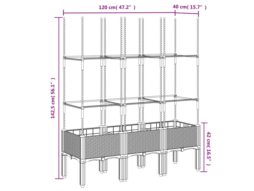 - Praktický design: Ideální dno pomáhá zadržovat vlhkost a umožňuje snadný odvod vody. Vestavěná treláž navíc nabízí oporu pro růst popínavých rostlin, jako jsou rajčata, hrášek nebo růže.
