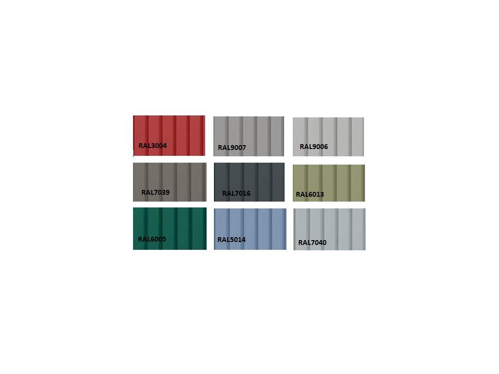 Barva: dle výběru 9 základních barev (RAL 3004, RAL 5014, RAL 6005, RAL6013, RAL 7016, RAL 7039, RAL 7040, RAL 9006, RAL 9007) VŽDY UVÁDĚJTE DO POZNÁMKY K OBJEDNÁVCE.