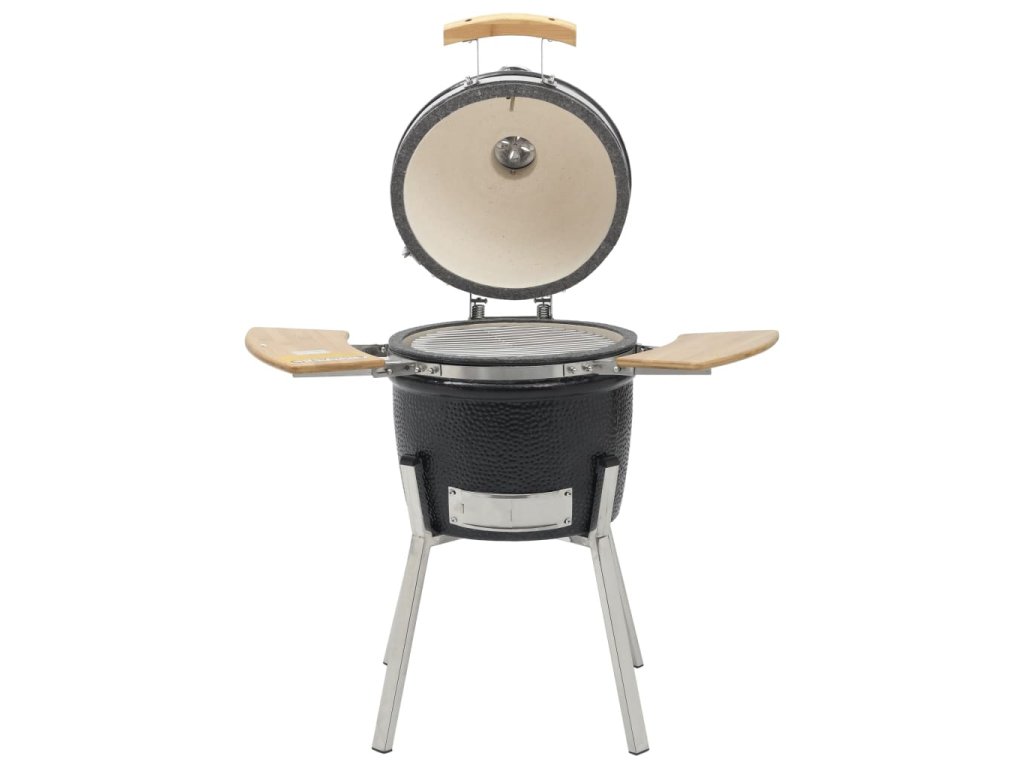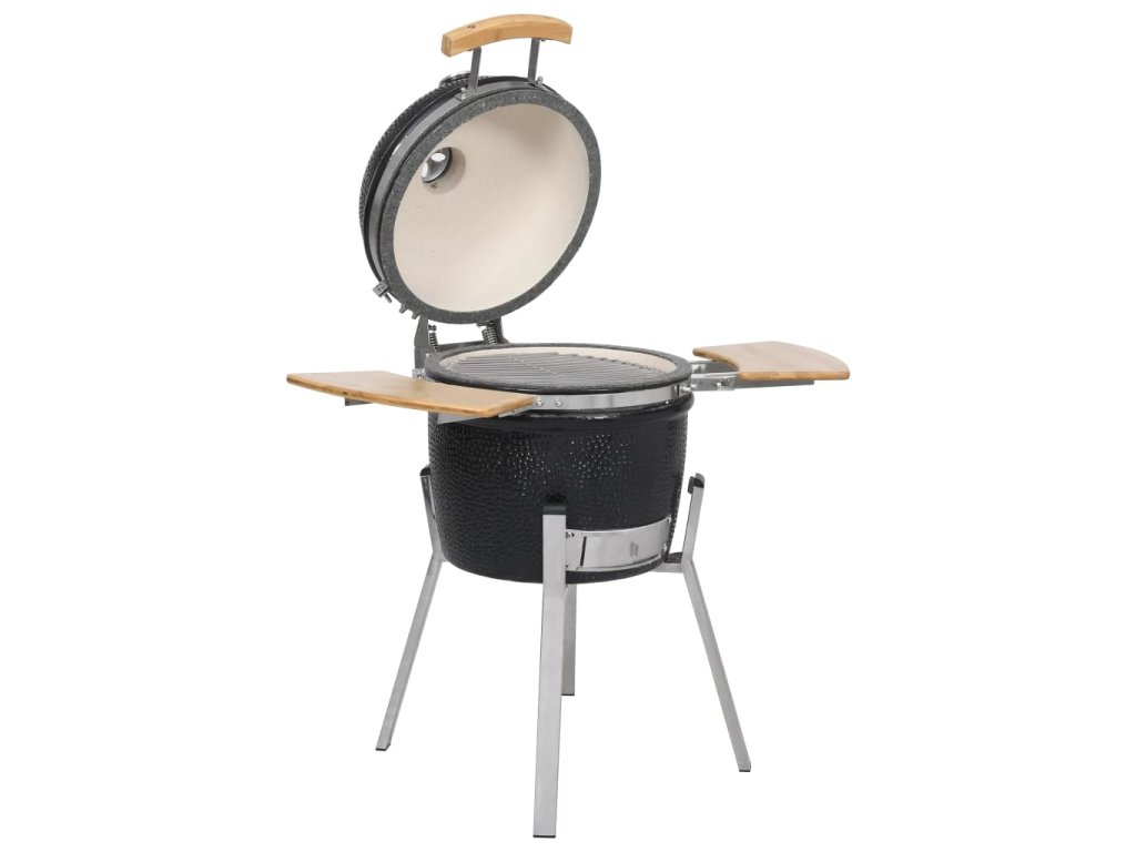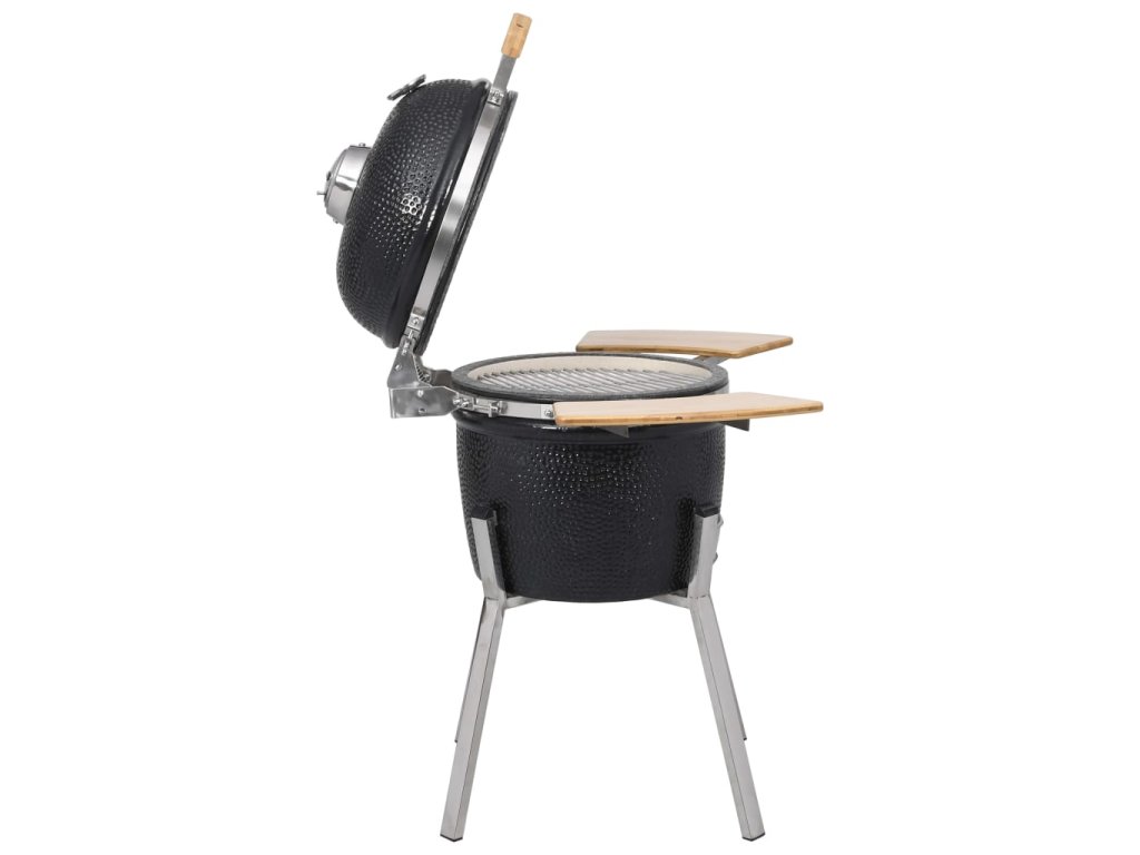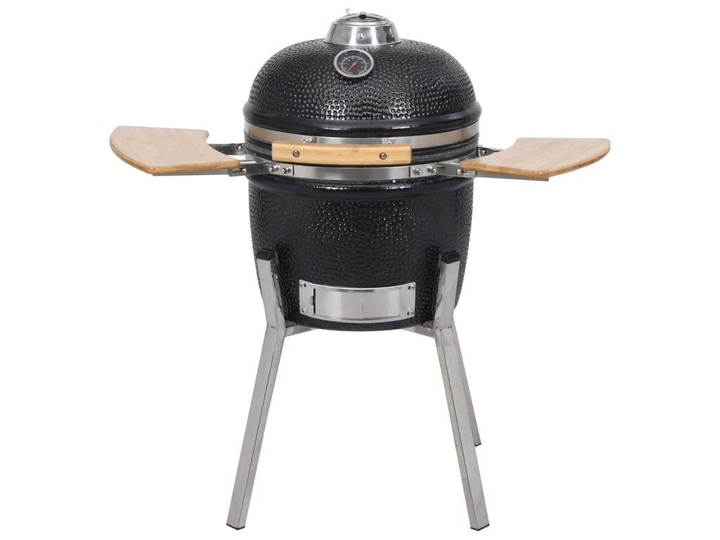 Tento keramický Kamado gril funguje s dřevěným uhlím nebo dřevem a má velkou mřížku s průměrem 27 cm . Nabízí několik funkcí , jako například grilování , pečení , uzení , vaření nebo je vhodný pro udržení jídla v teple . Tento keramický gril má robustní zavesný poklop s otvorem a teploměrem na vrchu . Díky dvouvrstvému ??průduchu můžete jednoduše ovládat průtok vzduchu a teplotu . Dvě skladatelné boční poličky vám poskytnou prostor pro uložení vašich grilovacích potřeb . Gril je vyroben z velmi kvalitní keramiky a má glazovaný povrch , který dodává grilu ještě větší odolnost . Zároveň je gril krásný i na pohled . Nožičky z nerezové oceli ho dělají extra stabilním . Tento kvalitní gril je vhodný pro přípravu různých druhů jídla , jako například burgery , žebra , ryby , pizza a podobně . Poskytne vám spolu s vašimi přáteli množství zábavy při přípravě jídla .