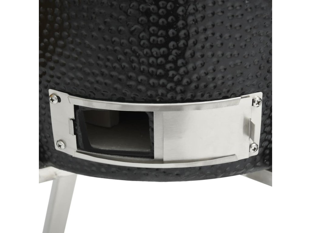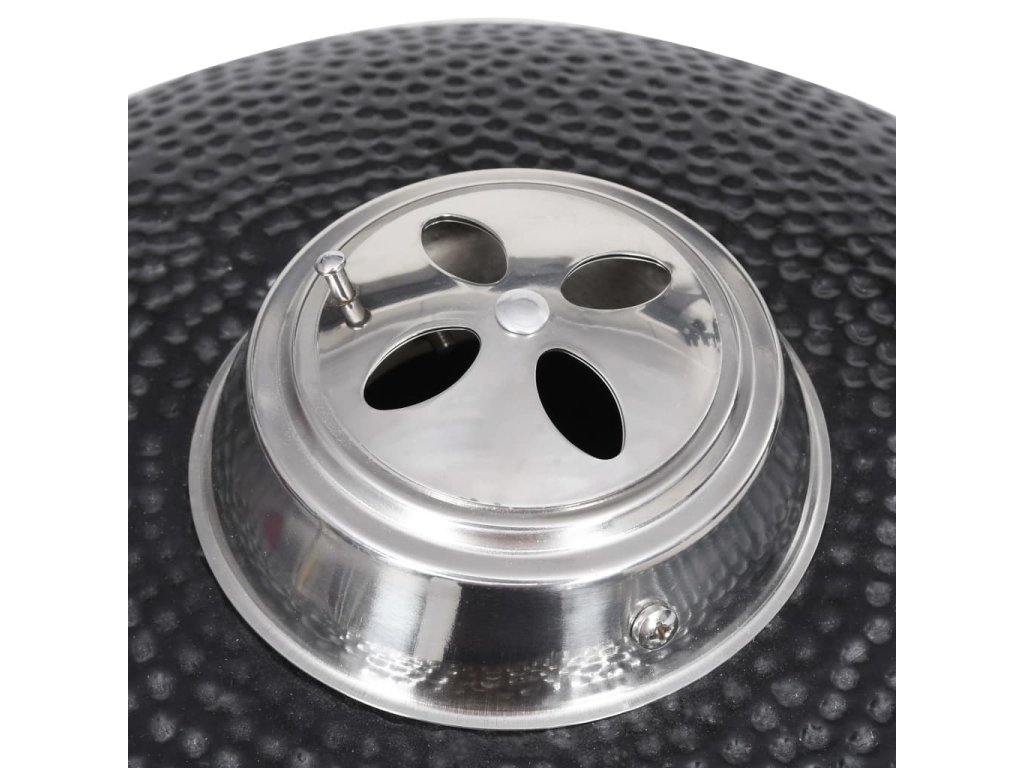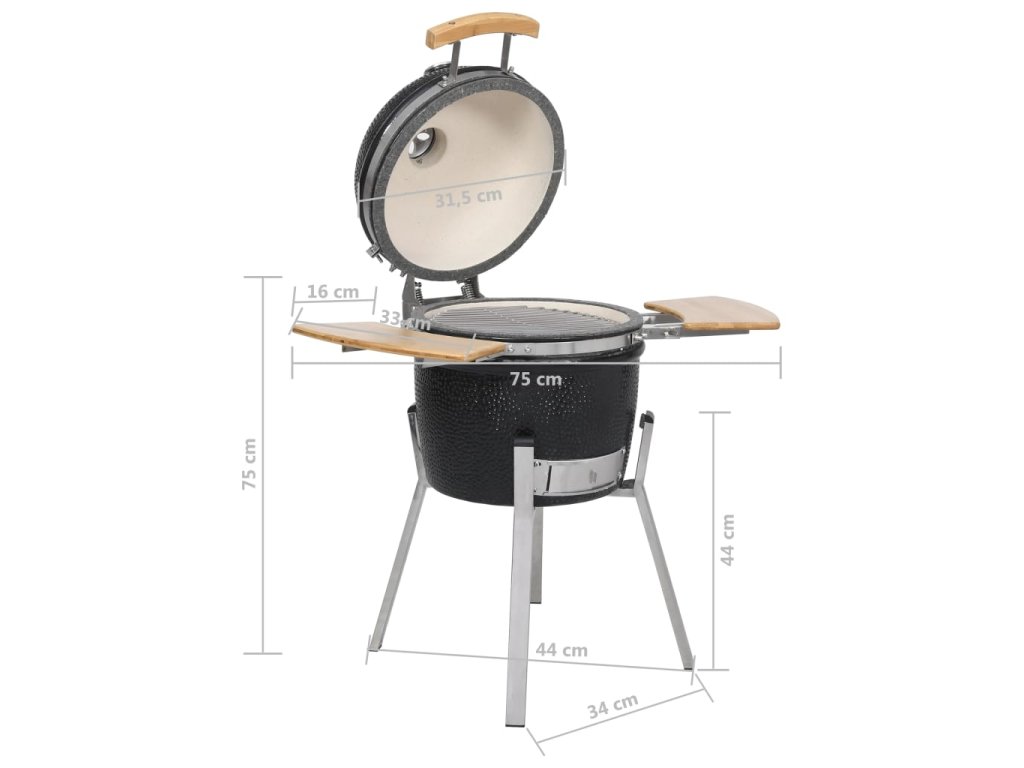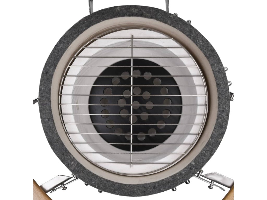 Tento keramický Kamado gril funguje s dřevěným uhlím nebo dřevem a má velkou mřížku s průměrem 27 cm . Nabízí několik funkcí , jako například grilování , pečení , uzení , vaření nebo je vhodný pro udržení jídla v teple . Tento keramický gril má robustní zavesný poklop s otvorem a teploměrem na vrchu . Díky dvouvrstvému ??průduchu můžete jednoduše ovládat průtok vzduchu a teplotu . Dvě skladatelné boční poličky vám poskytnou prostor pro uložení vašich grilovacích potřeb . Gril je vyroben z velmi kvalitní keramiky a má glazovaný povrch , který dodává grilu ještě větší odolnost . Zároveň je gril krásný i na pohled . Nožičky z nerezové oceli ho dělají extra stabilním . Tento kvalitní gril je vhodný pro přípravu různých druhů jídla , jako například burgery , žebra , ryby , pizza a podobně . Poskytne vám spolu s vašimi přáteli množství zábavy při přípravě jídla .
